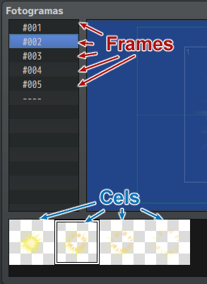 Para empezar aclararé que usaré la palabra «cel» (de animación) para cada uno de los dibujos distintos que podemos usar en una animación, y «frame» para cada unidad de tiempo en la que se ven estos dibujos en la pantalla. En otros contextos podría llamar «frame» a un «cel», pero sería lioso para esta guía.