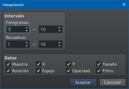 Simplemente añade el primer cel como hemos dicho antes, y haz lo mismo con el cel 10 en el frame 10, y pulsa interpolación. Elige de intervalo los fotogramas 1-10, y elige los cels (recuadros) 1 (aunque puedes dejar 16, ya que al sólo tener 1 cel tampoco cambiará nada). Por defecto todas las casillas están marcadas, pero el que nos interesa es Muestra. Pulsa aceptar y ahora el frame 2 tendrá el cel 2, el frame 3 tendrá el cel 3... así hasta 10.