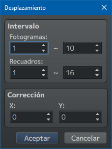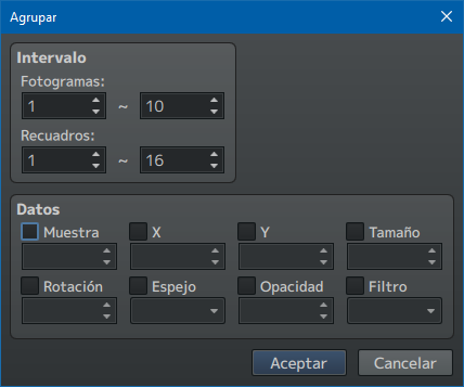 En cuanto a agrupar y desplazamiento, funcionan parecido. Con agrupar (mal traducido de batch, la verdad) puedes elegir los frames y cels que quieres editar de golpe, dándoles un valor específico (por ejemplo, X = 10, Y = -5). Mientras que con desplazamiento sólo puedes mover la X y la Y, y en lugar de darles un valor absoluto, puedes sumar o restar. Es decir, si escribes X = 3, se sumará al 10 de antes, dando 13. Y si escribes Y = 0, la Y se quedará en -5.