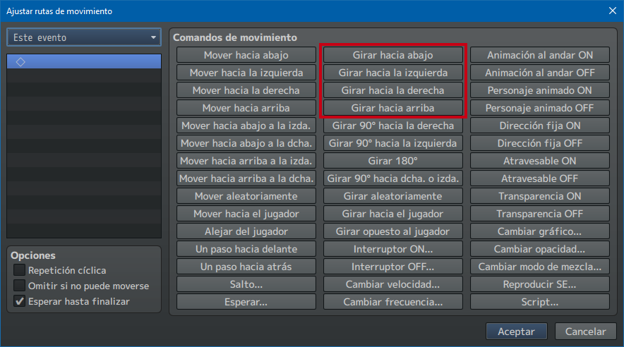 ¿Qué pasa si sí necesitas que se mueva cíclicamente? Entonces lo mejor es hacer esta transformación desde otro evento, ya que «Ajustar rutas de movimiento» sirve para cualquier evento del mapa. Haces un evento automático que lo haga y después lo borras con «Borrar evento».