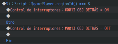 Esto se puede hacer muy fácil con un interruptor o una variable. Llamémosla «OBJ DETRÁS». En la derivación condicional del evento paralelo, pon que cuando se pise la región 8, se activa «OBJ DETRÁS». Y si no se está pisando la región 8 («otro»), se desactiva.