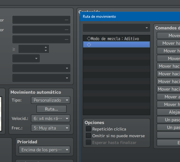 Ya en RPG Maker, sólo tienes que colocar el sprite, ponerlo en «encima de los personajes», y añadir «movimiento automático personalizado». Recuerda poner velocidad más alta y frecuencia más alta. Y en ruta sólo tienes que añadir: «Cambiar modo de mezcla». Ahí puedes elegir normal, aditivo, multiplicar y pantalla. En mi caso, aditivo es exactamente lo mismo que añadir (brillo) en Clip Studio, así que selecciono ese. Recuerda desactivar «repetición cíclica» y ya está.